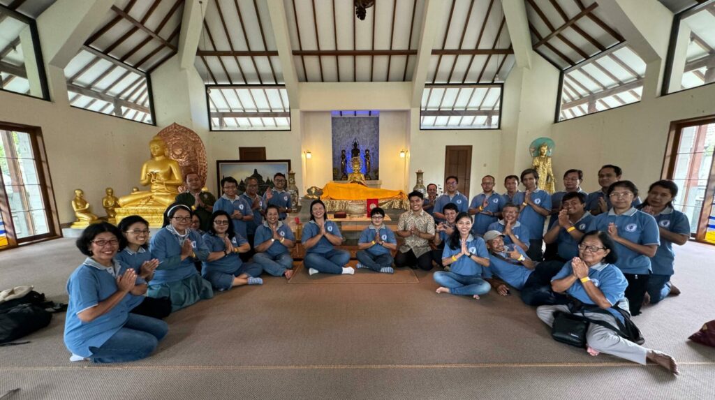 “Dengan mengenal dan berefleksi bersama Tradisi dan Peribadatan Budhis dan survey ke lokasi Candi Borobudur, serta silaturahmi ke Vihara Mendut tempat dimana para Biku tinggal, kita bisa memupuk rasa toleransi dan menghormati satu sama lain”, demikian ungkap Romo Dedi selaku koordinator kegiatan. Namun karena para Biku ada acara lain, maka rombongan diterima oleh salah seorang pengurus vihara, yakni calon Pandita Mas Utomo Wahyu. Mewakili para Biku, Mas Wahyu panggilan akrabnya, merasa dihormati dan bahagia karena bisa menerima kunjungan rombongan Komlit. Sebagai tanda mempererat tali persaudaraan, Romo Sunar menyerahkan kenang-kenangan kepada komunitas di Vihara Mendut berupa plakat bergambar Burung Pelican sebagai logo dari Keuskuapan Agung Semarang dan disusul oleh Romo Agus serta Romo Dedi yang menyerahkan 3 buku, yaitu buku yang berjudul Fratteli Tutti, lingkungan hidup dan Kearifan Lokal-Pancasila, buku yang mempunyai banyak makna dan pesan. Semoga perjumpaan yang singkat itu bisa ditingkatkan lagi dikesempatan-kesempatan lain, meskipun saat itu para rombongan tidak bisa berkeliling masuk area vihara karena suasana hujan cukup deras.