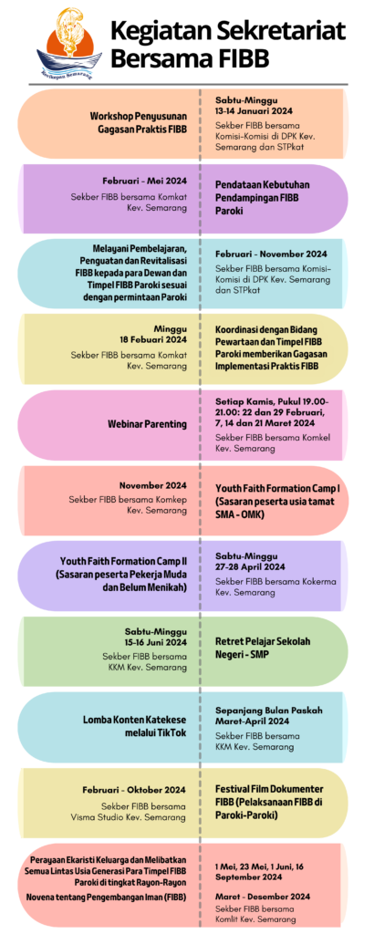 Berikut agenda kegiatan Sekretariat Bersama (Sekber) Formatio Iman Berjenjang dan Berkelanjutan (FIBB) selama tahun 2024.