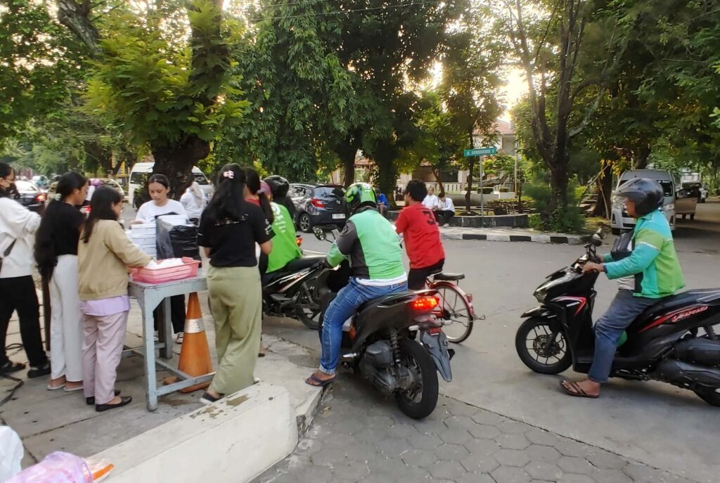Para driver ojek online menepi untuk memperoleh takjil di depan gereja (dok. Komsos Atmo)