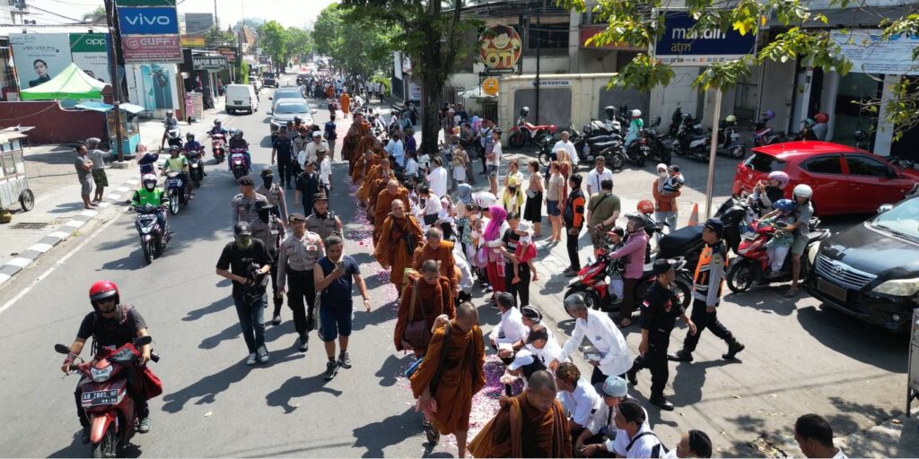Dalam perjalanannya para Biksu dikawal oleh apparat TNI dan POLRI serta relawan dari berbagai macam agama. Di sepanjang jalan juga banyak warga yang menyambut dengan antusias. (Christopher Yoga Mahardhika)