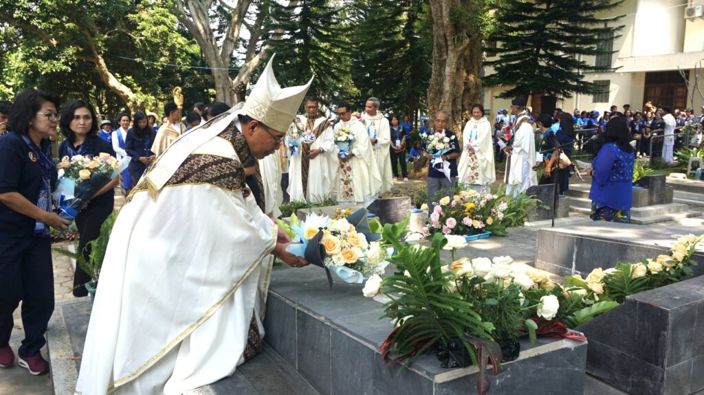 Seusai Ekaristi, Bapa Uskup bersama para romo menandatangi komitmen sebagai agen perubahan pada kain sepanjang 100 meter yang bertuliskan “Perempuan Sebagai Agen Perubahan: Pencegahan Kekerasan Seksual pada Perempuan, Anak dan Dewasa Rentan”. Selanjutnya Bapa Uskup melakukan tabur bunga di pusara Ibu RA Maria Soelastri pendiri Wanita Katolik RI.