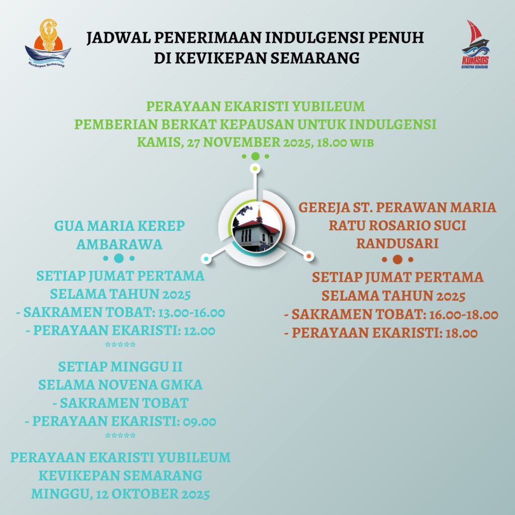 Menjadi berkat yang luar biasa, Paus Fransiskus menyelenggarakan Tahun Yubileum 2025. Paus mengajak seluruh umat beriman untuk menjadi peziarah harapan dan memperoleh indulgensi penuh, tanda kerahiman Allah yang tidak terbatas bagi umat beriman dan bagi jiwa-jiwa yang sudah meninggal. Keuskupan Agung Semarang mensyukuri rahmat yang tak terbatas tersebut dengan menyelenggarakan pelayanan Ekaristi dan penerimaan Sakramen Tobat guna memperoleh indulgensi penuh. Mari kita menikmati rahmat indulgensi, tanda kemurahan Tuhan yang tiada batasnya.