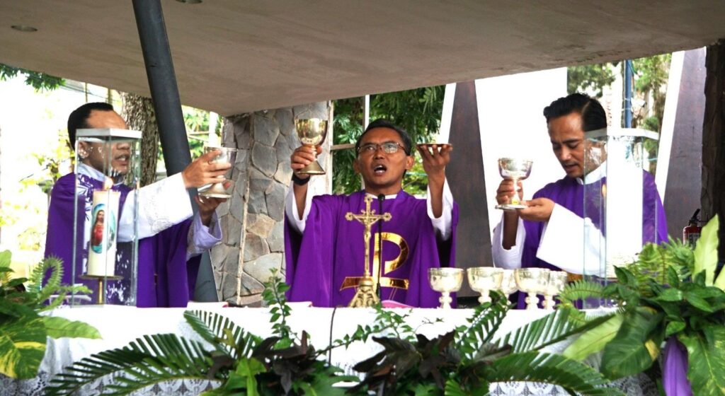 Siang itu tepat tengah hari misa konselebrasi dipersembahkan oleh trio MSF: Romo Yusup ‘Nano’ Sunarno, MSF (Pastor Paroki Atmodirono), Romo Petrus Yuwono Hendro Prasetyo, MSF (Novisiat MSF Salatiga), dan Romo Benediktus ‘Ben’ Mbemba Budo Bedi, MSF (Vikaris Parokial Salatiga). Misa Yubileum Maret 2025 ini dilayani oleh Paroki Atmodirono, mulai dari petugas koor, lektor, pemazmur, kolektan, juga tatib.