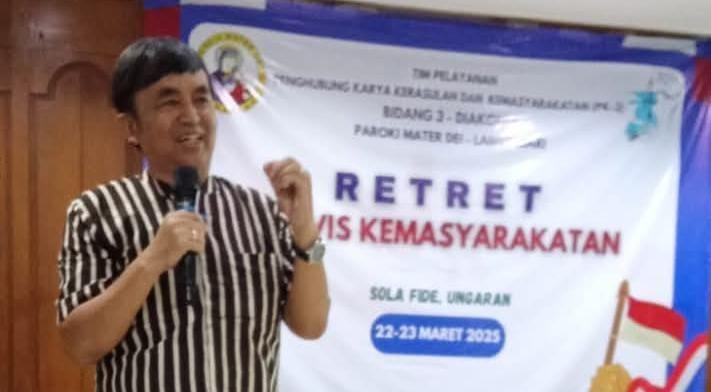 Lampersari – Sebanyak 55 aktivis kemasyarakatan dari Paroki Mater Dei Lampersari Semarang mengikuti retret di Lembah Kemenangan Solafide, Ungaran, Sabtu-Minggu (22-23/3/25). Mereka terdiri dari pengurus RT, RW, LPMK, ASN, TNI, Polri, dan anggota ormas. Kegiatan yang diselenggarakan oleh Tim Pelayanan Penghubung Karya Kerasulan Kemasyarakatan (PK3) ini menghadirkan tiga narasumber: Romo FX Endra Wijayanto, FX Triyas Hadi Prihantoro, dan Lilik Rizzki Siswanto.