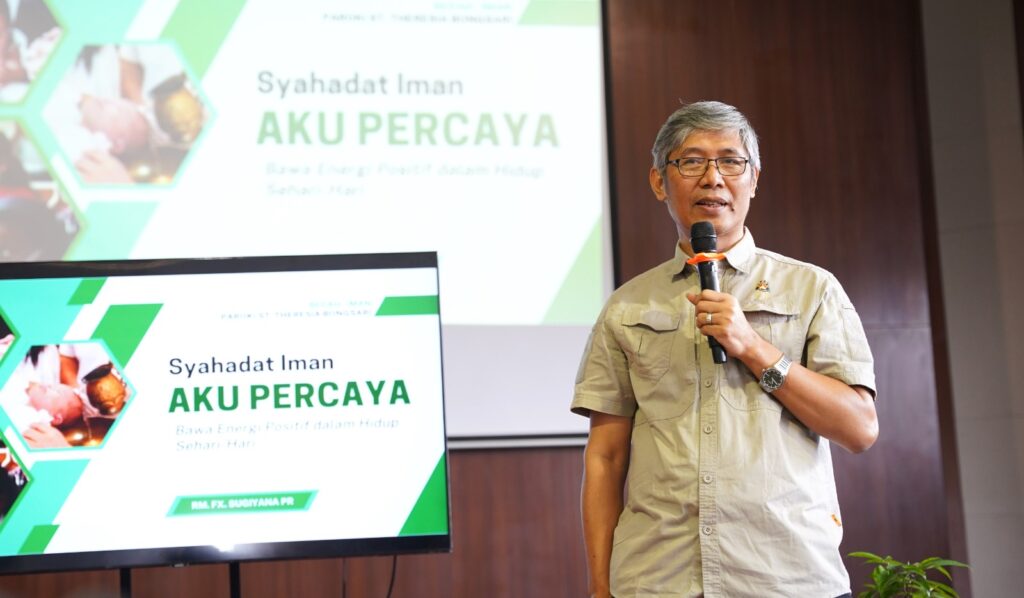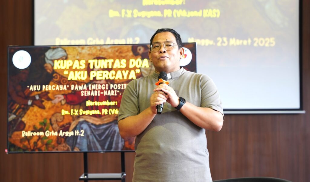 Bongsari – Credo atau Aku Percaya bukanlah sebatas doa, melainkan ungkapan pernyataan iman umat Kristiani. Demikian disampaikan oleh Vikaris Jenderal Keuskupan Agung Semarang Romo F.X. Sugiyana, Pr. dalam acara penyegaran iman yang bertajuk ‘Aku Percaya: Bawa Energi Positif dalam Hidupku Sehari-hari‘ di Grha Argya Paroki Santa Theresia Bongsari, Semarang, Minggu (23/3/25).