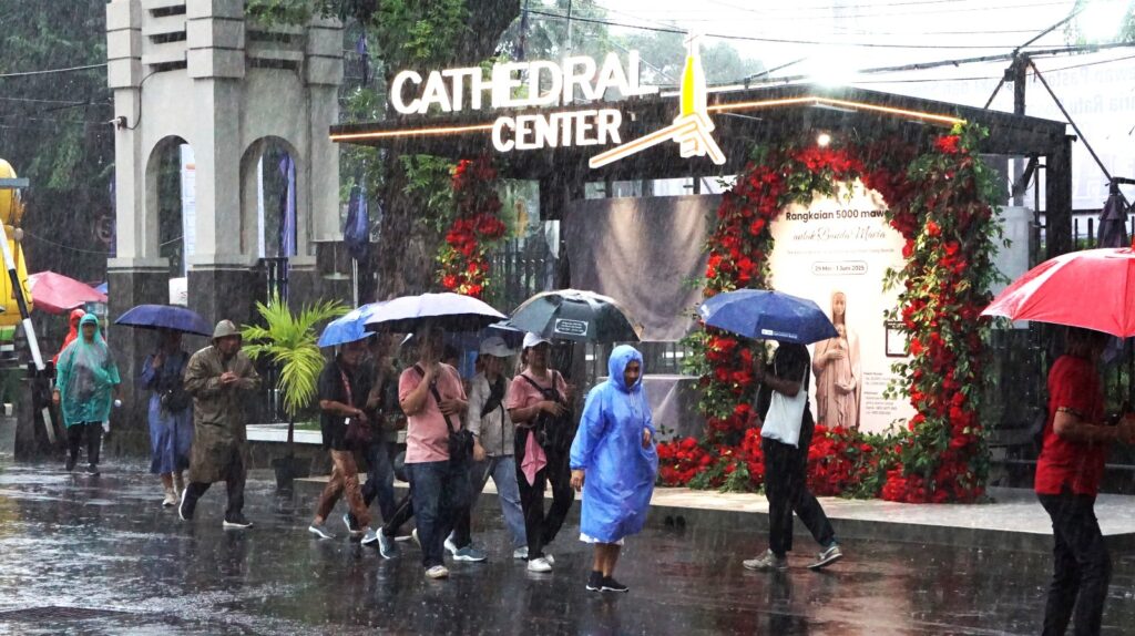 Hujan lebat, Jumat (28/3/25) sore itu, tak menyurutkan niat mereka untuk terus melangkahkan kaki sebagai peziarah pengharapan. Mereka ada yang mengenakan payung, jas hujan, bahkan ada yang hanya berselubungkan plastik untuk melindungi kepala dan badan. Tampak diantara peziarah adalah para suster dan lansia. Sekitar pukul 16.30 beberapa peserta telah bergerak memasuki kawasan Katedral. Tak ada wajah kelelahan, sebaliknya terpancar rona kegembiraan.