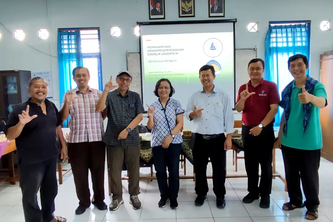 Yogyakarta – Pada hari Sabtu (12/4), Tim Laudato Si Universitas Atma Jaya Yogyakarta (UAJY) melakukan pendampingan kepada SD Kanisius Sengkan Yogyakarta dalam upaya mengimplementasikan dan mewujudkan ensiklik Laudato Si atau “Merawat Bumi”. Kegiatan yang diikuti oleh 25 peserta dari jajaran pengurus sekolah ini merupakan wujud nyata kepedulian UAJY dalam mendukung institusi pendidikan yang berkomitmen merawat lingkungan.