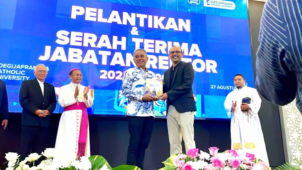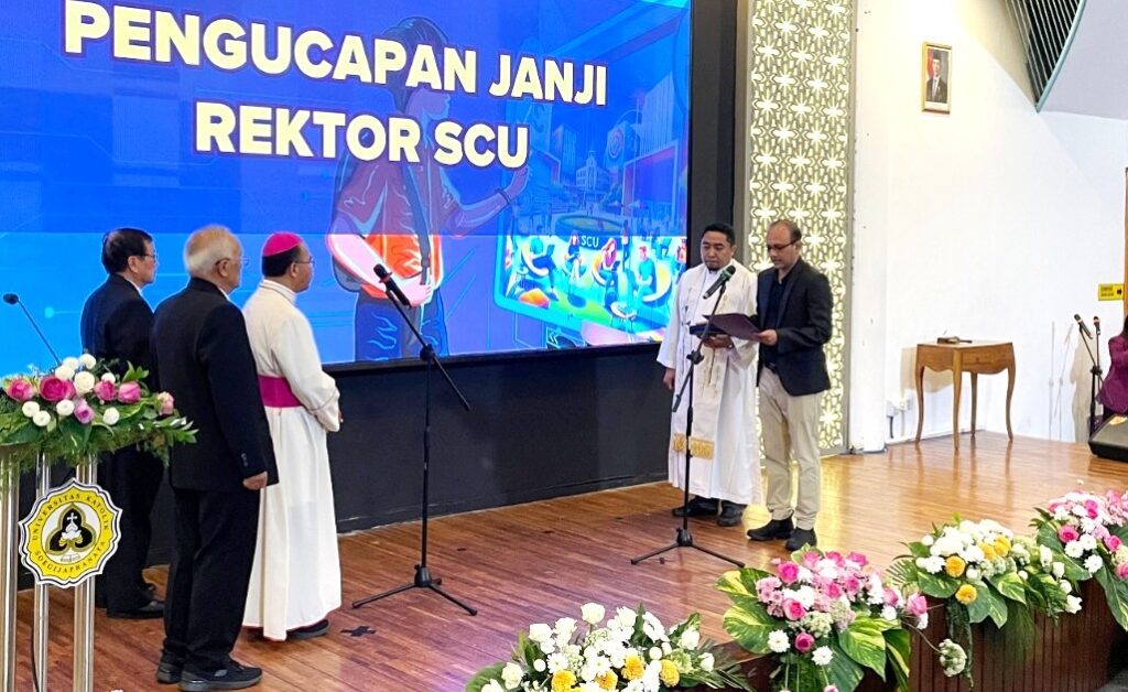 Semarang – Uskup Agung Keuskupan Agung Semarang (KAS) sekaligus Ketua Dewan Pembina Yayasan Sandjojo, Mgr. Robertus Rubiyatmoko, resmi melantik Ir. Robertus Setiawan Aji Nugroho, ST, M.Comp.IT., Ph.D sebagai Rektor Soegijapranata Catholic University (SCU) periode 2025-2029. Pelantikan berlangsung di Teater Thomas Aquinas, Kampus 1 SCU Bendan, Rabu (27/8/25), bertepatan dengan serah terima jabatan dari rektor sebelumnya, Dr. Ferdinandus Hindiarto.