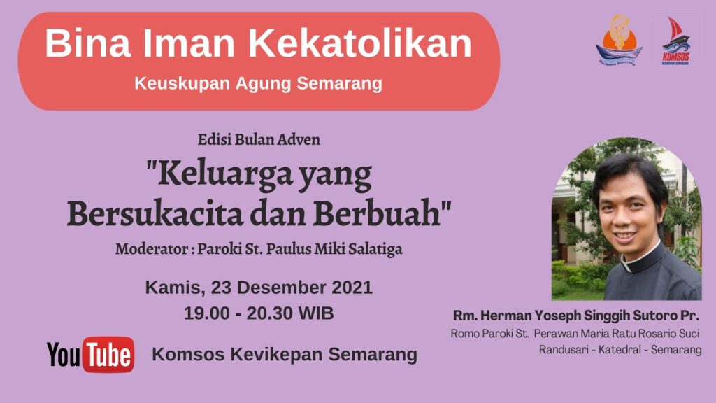 Bulan Desember merupakan moment Adventus. Maka untuk memperdalam secara khusus pengetahuan iman menyangkut Masa Penantian Natal (Adven). Pada Kamis, 23 Desember 2021, Pukul 19.00-21.00 diselenggarakan Pengayaan Pengetahuan Iman mengenai Pertemuan Adven IV: Keluarga yang Bersukacita dan Berbuah bersama Rm. Herman Yoseph Singgih Suntoro, Pr