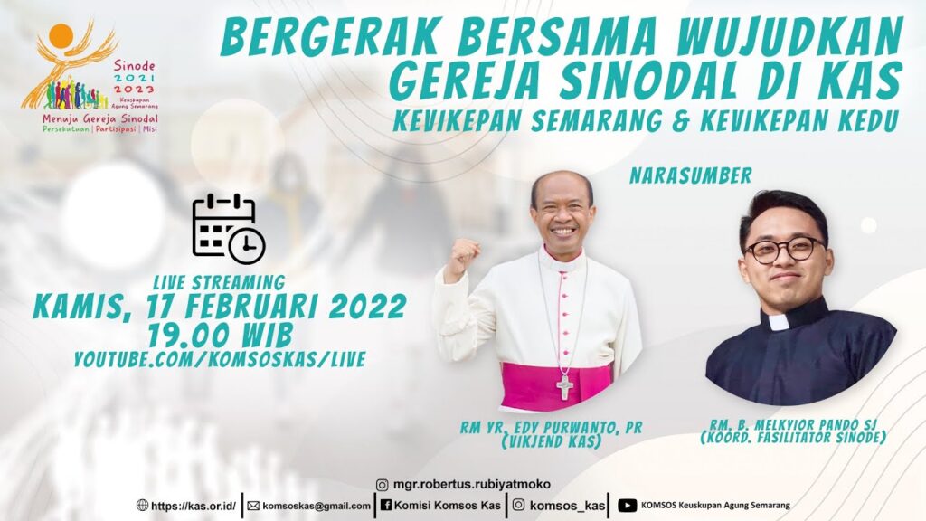 Tema sinode kali ini adalah: “Bagi Gereja Sinodal: Persekutuan, Partisipasi dan Misi”. Pada Kamis, Tanggal 17 Pebruari 2022, Pukul 19.00-21.00 diselenggarakan Sosialisasi Sinode KAS untuk Kev. Semarang & Kev. Kedu. Direncanakan proses sinode ini mempergunakan pendekatan Sarasehan Umat, Percakapan Rohani, dan Kuesioner. Tiga bentuk pendalaman ini masih ditambah dengan bentuk-bentuk kreativitas bersinode misalnya dengan melakukan […]