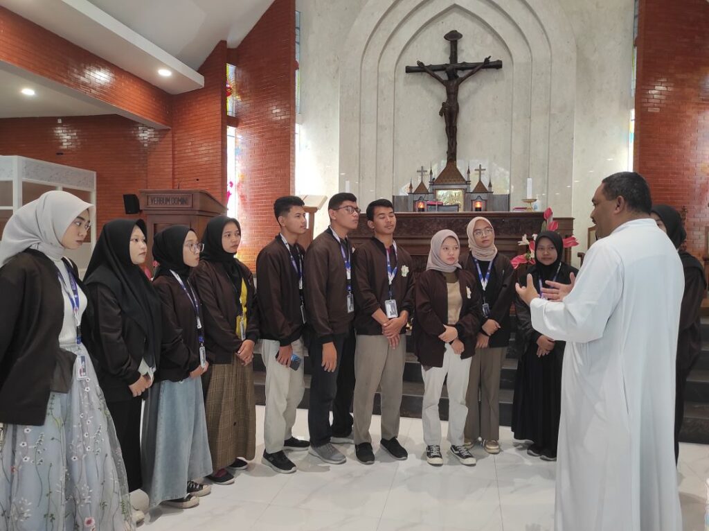 Senyum hangat Pastor Paroki Hati Yesus Yang Maha Kudus Purwodadi, Romo Emanuel Nuwa, MSF menyambut kehadiran para mahasiswa dan mahasiswi dari IAIN Kudus pada hari Minggu, 22 September 2024. Mereka turut hadir dalam Perayaan Ekaristi Kudus dan dengan khidmat mengikuti Perayaan Ekaristi untuk mengenal tata cara beribadah Agama Katolik.