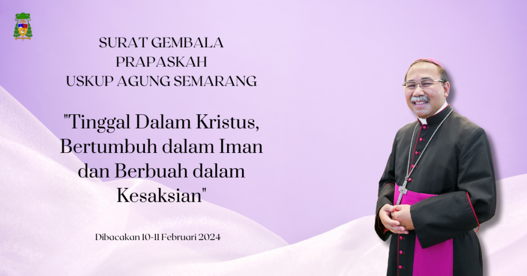 Saudara-saudari, Umat Allah di Keuskupan Agung Semarang yang terkasih, mari kita membaca bersama Surat Gembala Prapaskah Uskup Agung Semarang yang berjudul ‘Tinggal Dalam Kristus, Bertumbuh dalam Iman dan Berbuah dalam Kesaksian’.