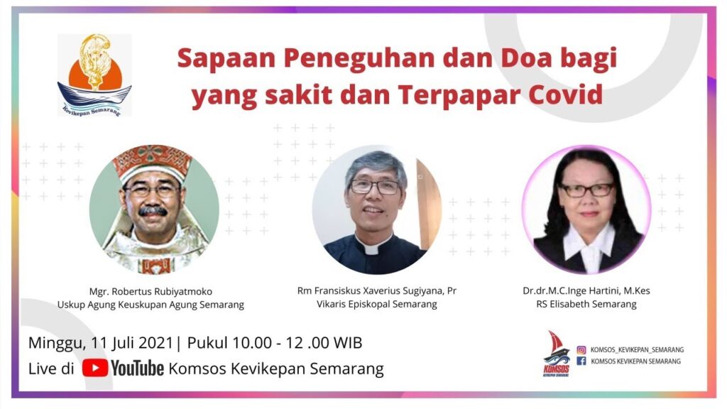 Sapaan Peneguhan dan Doa bagi yang sakit dan Terpapar Covid putaran VI , Minggu, 8 Agustus 2021, Pukul 10.00-12.00 WIB. Rm. Vikaris Episkopalis Semarang Rm. F.X. Sugiyana, Pr, ditemani Rm. Johanes Wegig Hari Nugroho, Pr. dan Ibu dr. ME. Wati Windayani, Sp.GK- Tim Kesehatan Kevikepan.