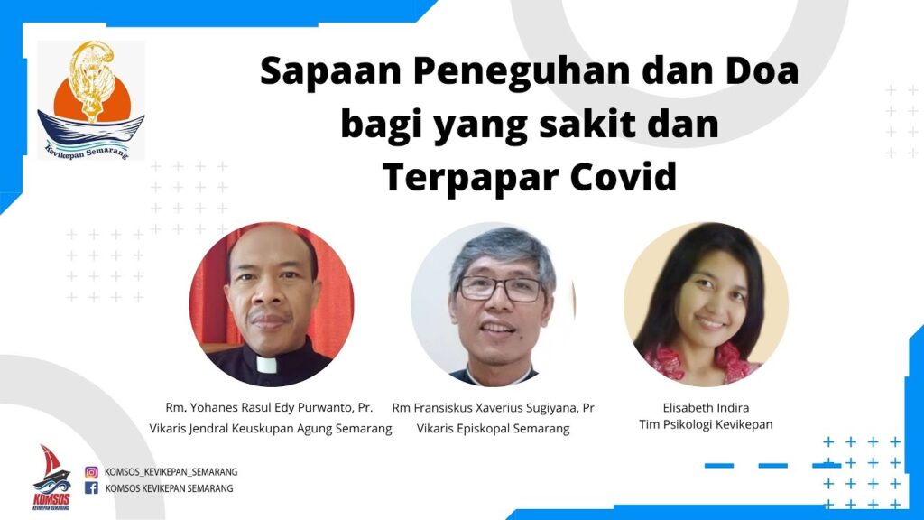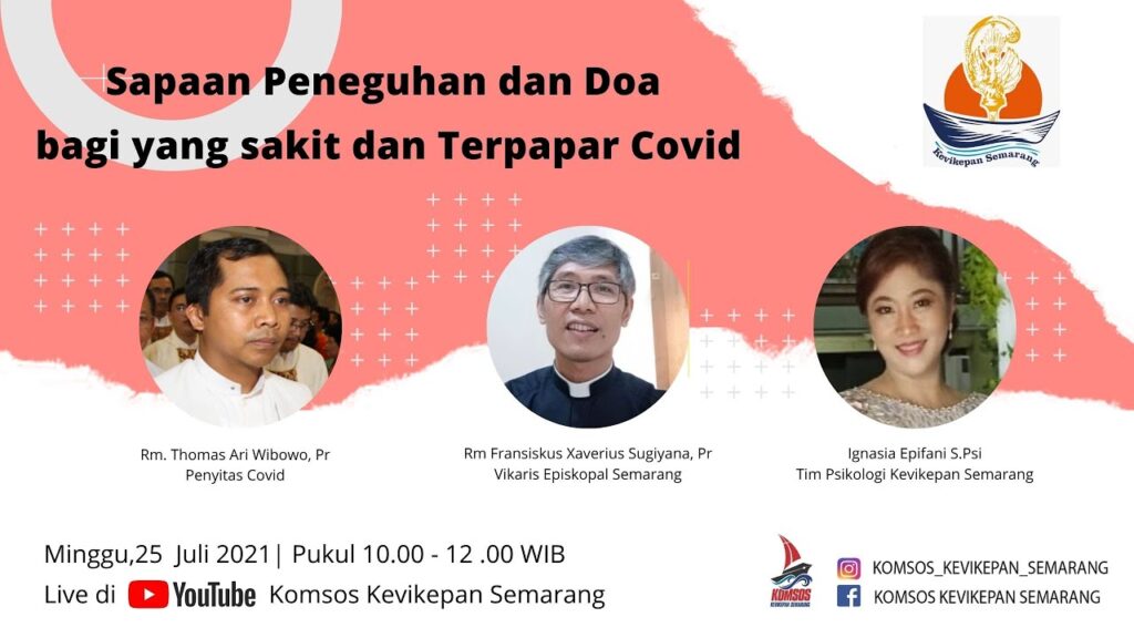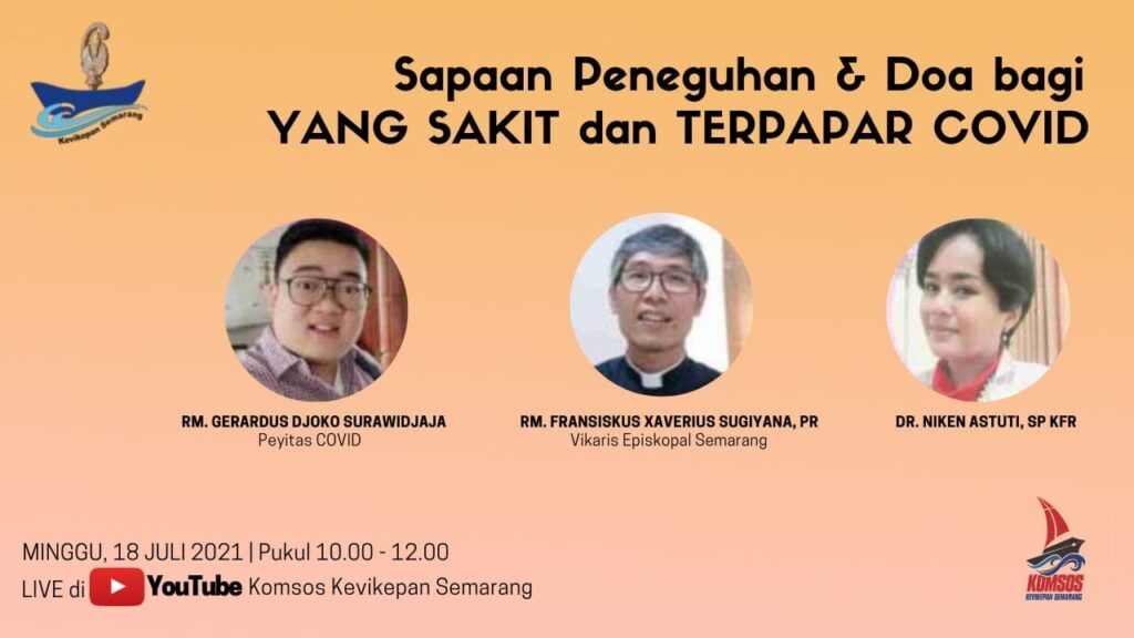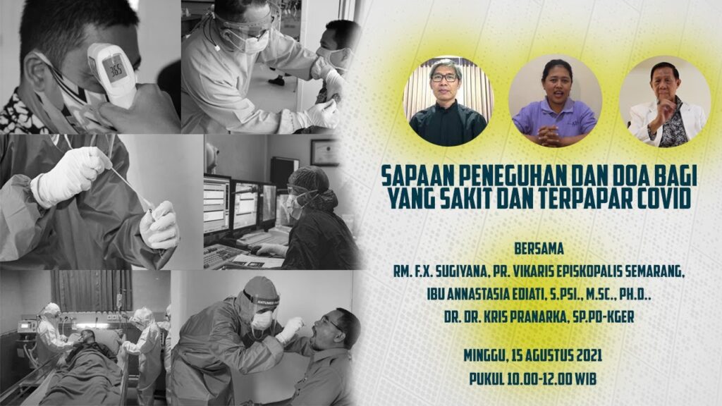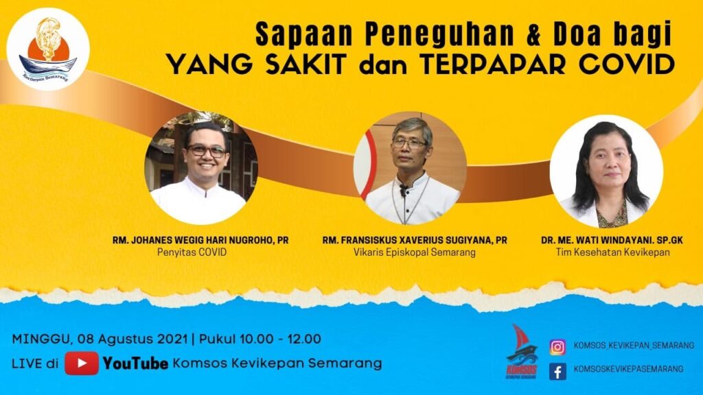 Sapaan Peneguhan dan Doa bagi yang sakit dan Terpapar Covid memasuki putaran ketjuh. Pada Minggu, 15 Agustus 2021, Pukul 10.00-12.00 WIB ini, bersama Rm. Vikaris Episkopalis Semarang Rm. F.X. Sugiyana, Pr mengundang narasumber ahli Ibu Annastasia Ediati, S.Psi., M.Sc., Ph.D.. dan dr. Kris Pranarka, Sp.PD-KGER. Di dalam acara ini, selain doa, juga akan dibahas mengenai […]